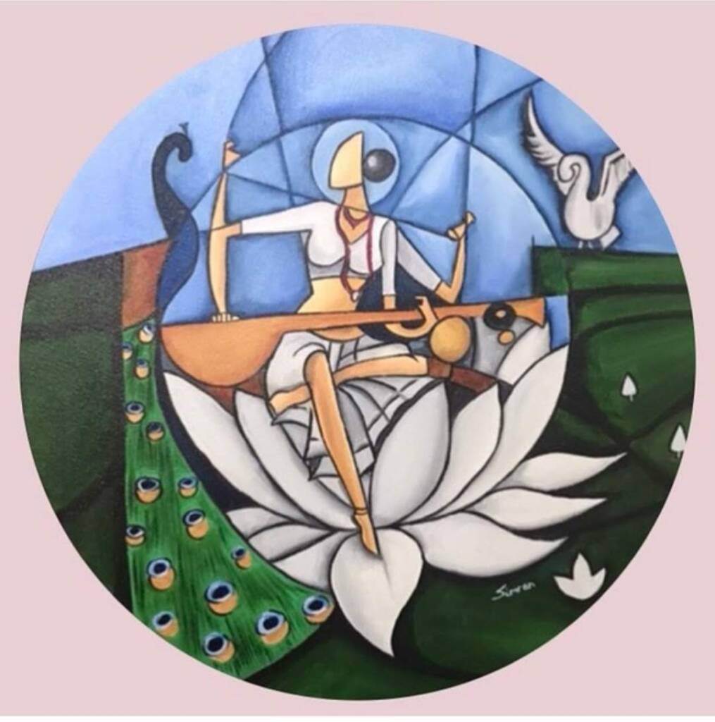 On the auspicious day of Diwali, Desee is showcasing her AURA series which depicts abstract forms of Goddesses Lakshmi & Saraswati. Most of these paintings are done on round stretch canvas frames of 16” diameter.