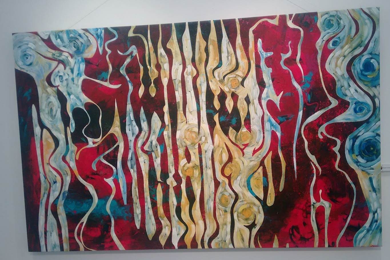 Beholding to the phantasmagoria with askew alignment of brushstrokes, Rajesh Pullarwar forged several au naturel curves of a colleen paying hazy tribute to Van Gogh’s The Starry Night. The unique way of his erection has stamped on it’s viewer the effect of illusion throughout the canvas. The intensive Maroons have their own Tartarean hue, inevitably felt with closed eyes in high beam whereas the floating amber pops baby doll’s face out. Around the corners of the surface, sleek and slim lines flow across the curvy body in acrylic sapphire. The continuous painting depicts the artist’s blear sensual imagination throwing assured notion of pleasure.⠀
