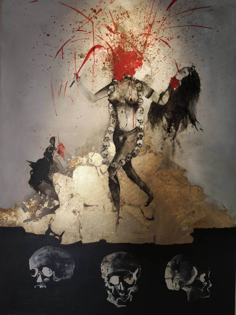 The thrilling emphasis of blood sprouting, corrals all eyes to this form of Chinnamasta. Grey and lemony setting of the picture was deliberately splashed at the corners in order to throw escalated attention towards the Tantric deity. Sara Khalafii had elegantly sprinkled and fondled the blood red acrylic visualising a real severed head. Strong yet fine brush strokes seen through Her open hair glorifies the artist’s constancy and devotion to the canvas. She is a life-giver and life-taker and speaks of self sacrifice as well as sexual dominance and power. The Yogini towards the left guzzles the pure blood while wrapped by a snake around her neck. Transition of the chapped gold flakes around the feet of the Devi representing Her royalty and honour makes it the best point to rest the eyes on.