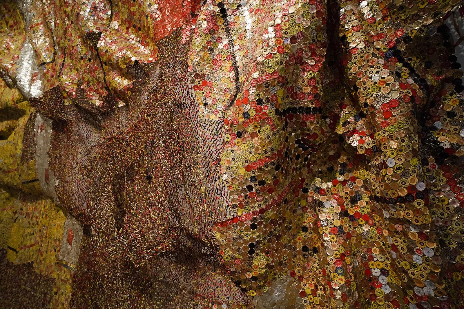 Illustrating the history and functions of objects, Anatsui dwells in historical storytelling. With the bottle caps, the history of the transatlantic trade and slave trade is embedded; the Africans were sent to America to produce rum and other things, which came back to Europe and finally to Africa. The bottle caps are objects linking three continents of history here.