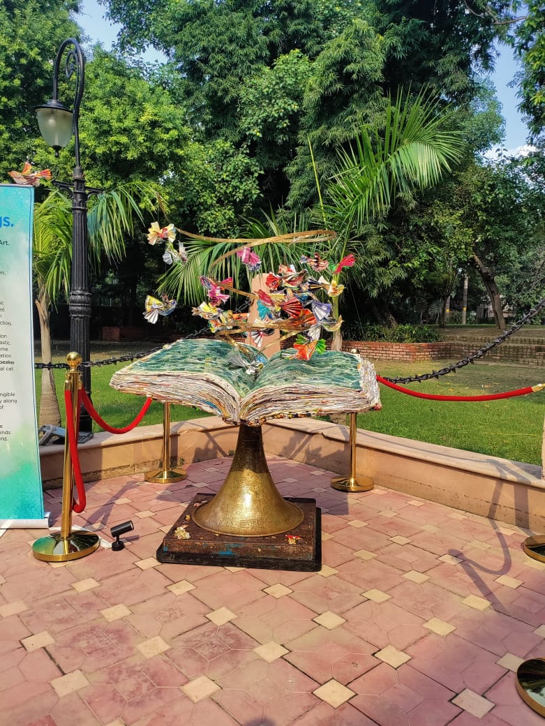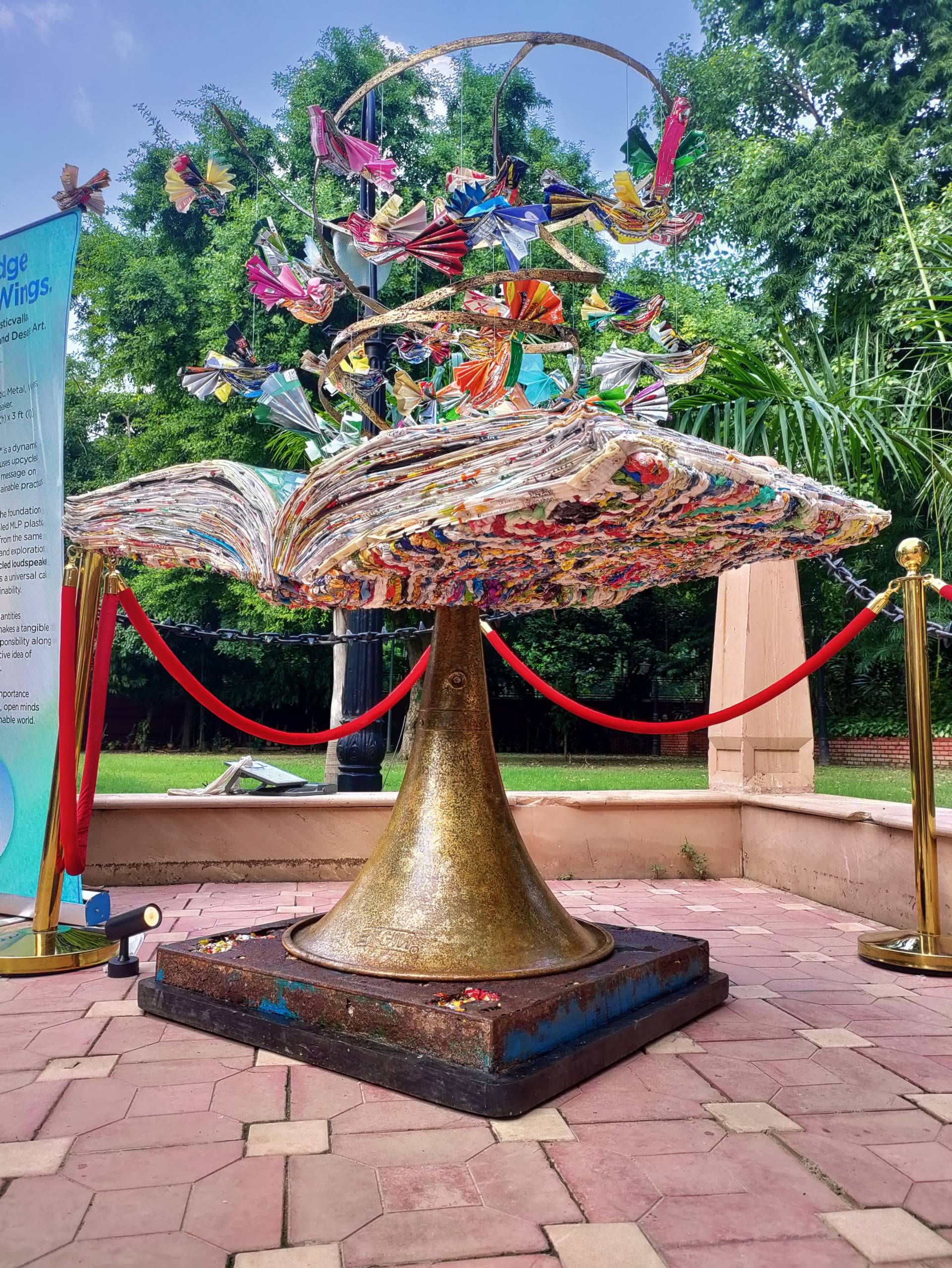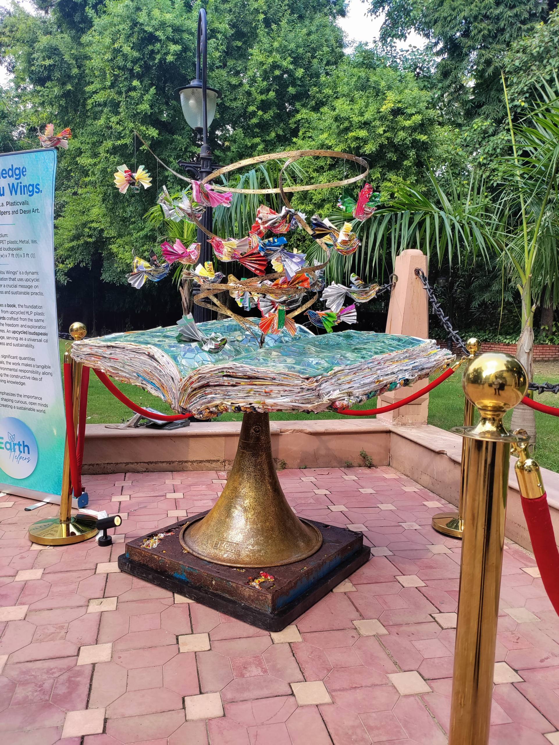 The centerpiece of the installation, a book, the foundation of knowledge, is made from upcycled MLP plastic. Above it, birds that are also crafted from the plastic wrapper waste, soar.