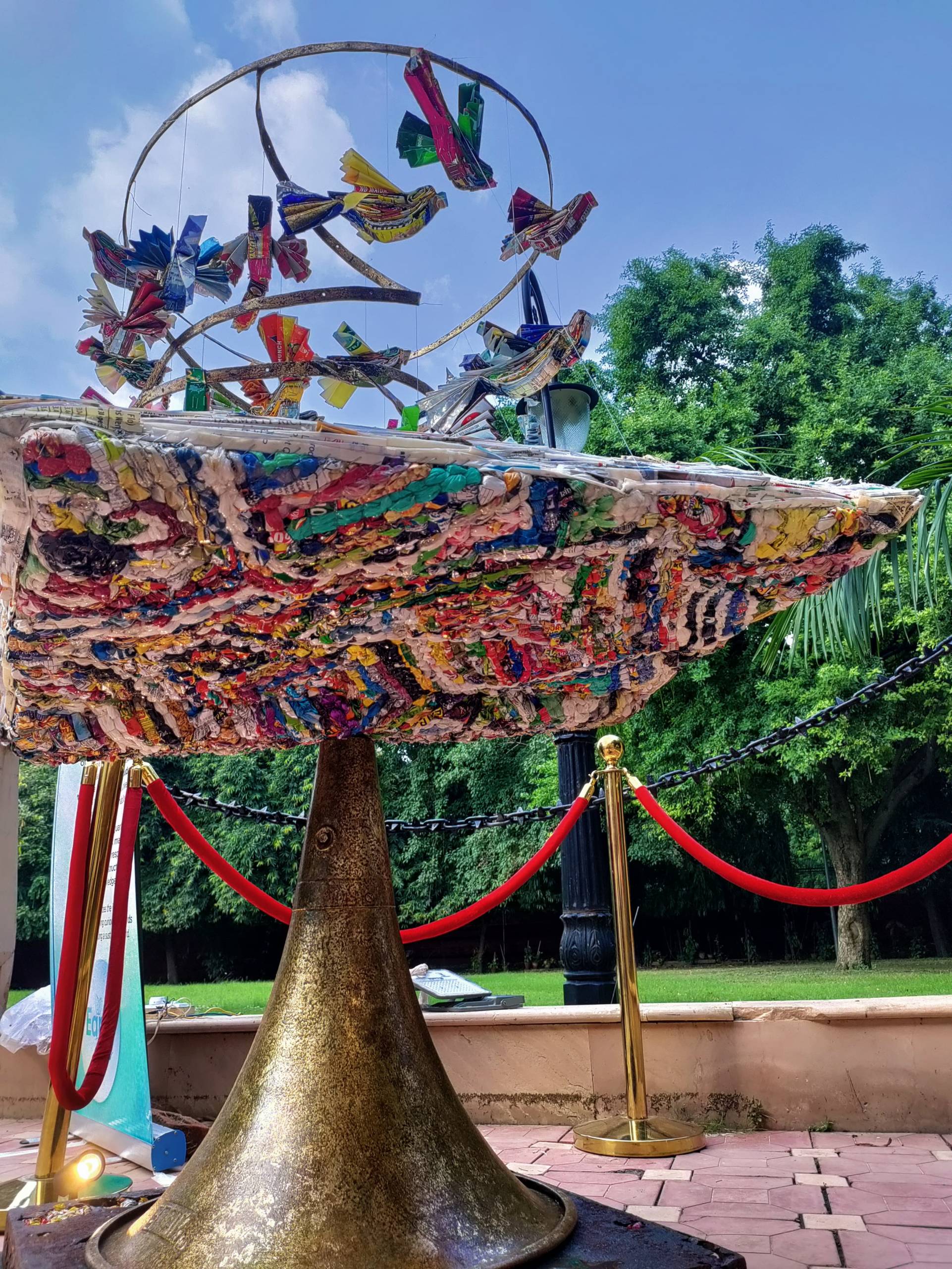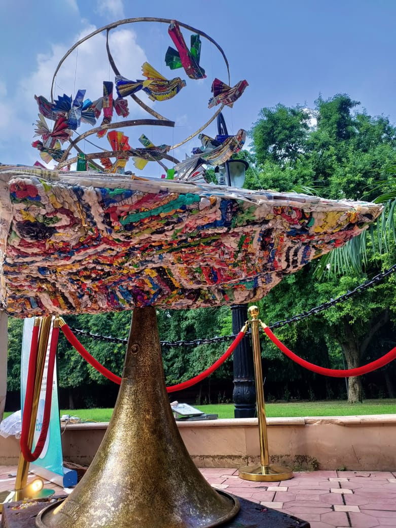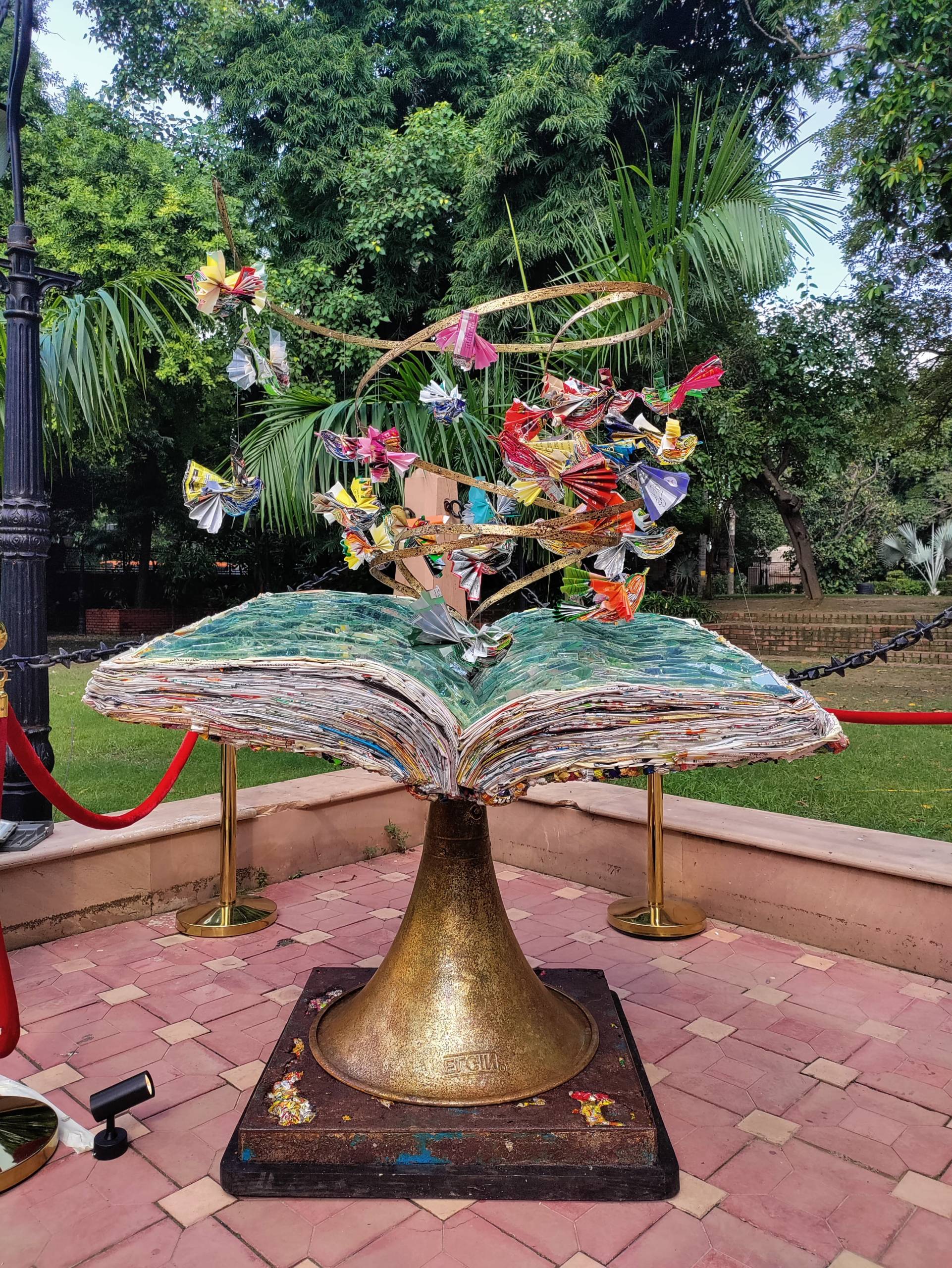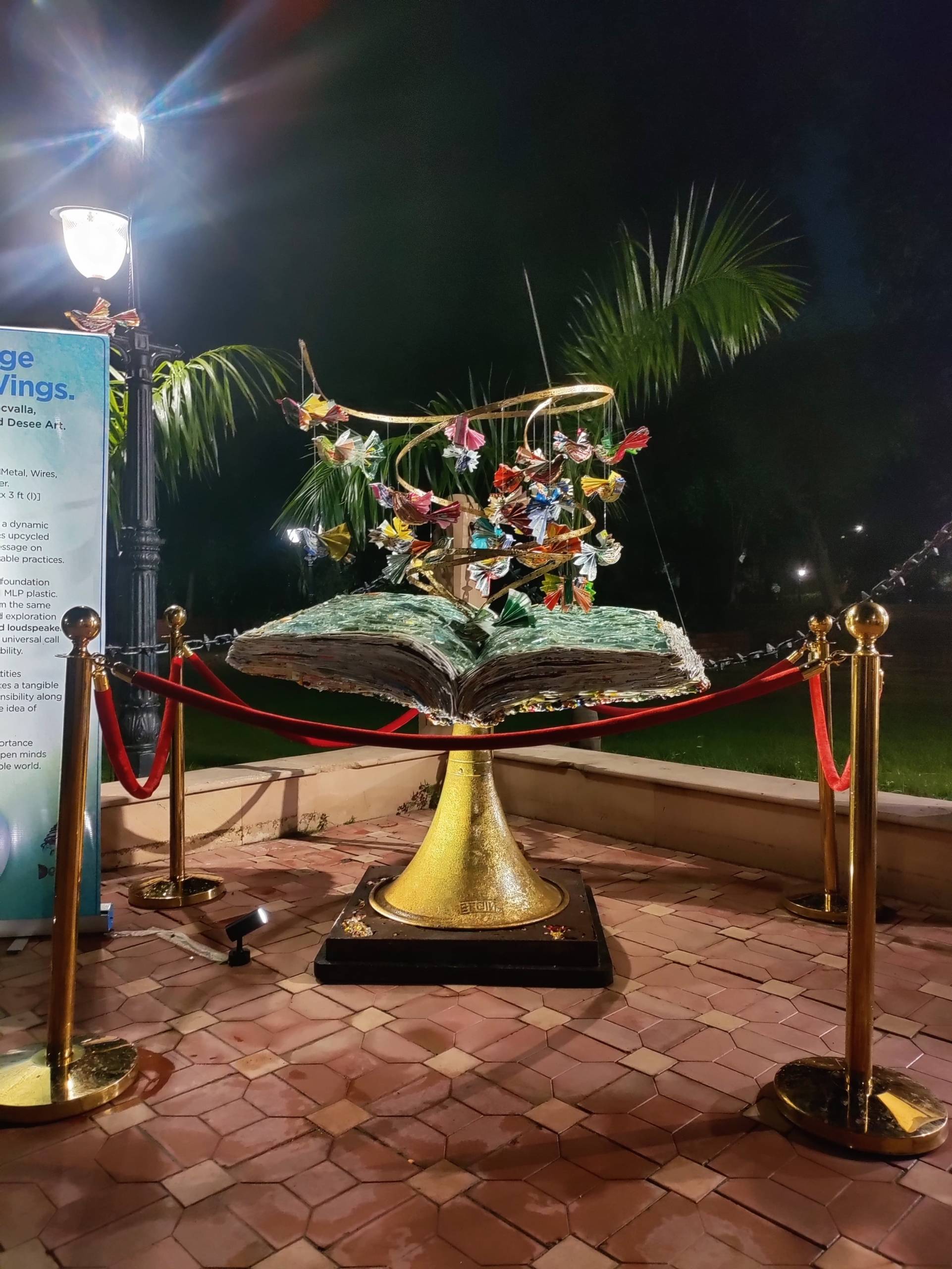 The centerpiece of the installation, a book, the foundation of knowledge, is made from upcycled MLP plastic. Above it, birds that are also crafted from the plastic wrapper waste, soar.