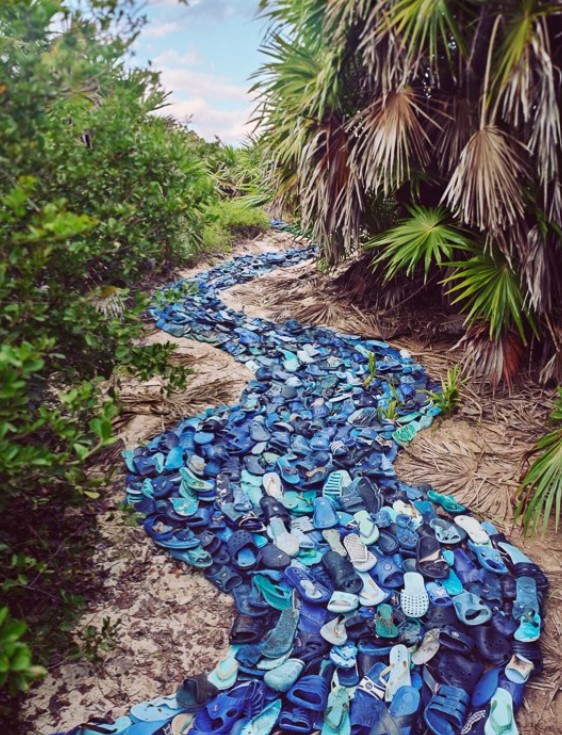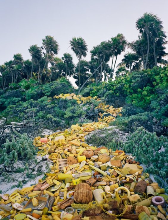 The project ‘Washed up: Transforming a trash landscape’ fits into the genre of Environmental Art where he works with photography, land art and installation in an interdisciplinary manner, commenting on the global disease of consumerism and disposable culture. Arranging plastic debris at natural landscapes, the project documents plastic waste from fifty different countries on six continents on the coast of Sian Ka’an. His work involves painstakingly collecting and categorizing plastic waste by color and type, creating haunting installations that juxtapose the vibrancy of the materials with the somber reality of pollution. The plastic waste is not painted by the artist, rather arranged and assembled in a painterly manner based on color; sometimes he arranges them as the waves would do or at times merge them into the landscapes as different natural components as algae,roots or rivers; showing the plastic invasion in nature.