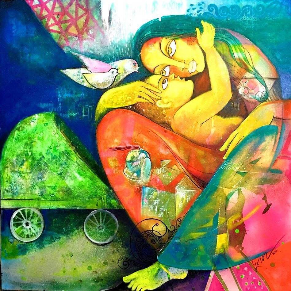 A woman wears many faces, motherhood being one of them. Motherhood itself brings with it an entire gamut of emotions. While tenderness and care are a mother’s hallmarks, fierce protectiveness is too. A mother can be both a lamb and a lioness. Tyagi depicts this tenderness through the bird and her fledgling, which she nurses protectively under her wing. It is through her scent, her voice, and her embrace alone that a baby, no matter how agitated will fall silent. No matter what other material comforts may be offered in the form of a cozy pram or cot, there is nothing more soothing to a child, than the mother’s lap. The bonds of motherhood are forged even before the child sees the world, which is why this bond is often the strongest and most enduring. It is rightly said that no one can know a child better than its mother because her relationship trumps every other by nine additional months, which none can compete with.