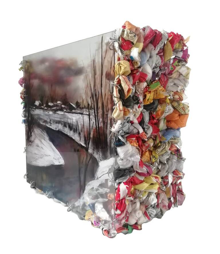 Created with acrylic sheets with a landscape painting visible in the front, the user can gradually build a habit of waste management while accumulating plastic waste at home and later on recycle/upcycle it. The landscape slowly merges with the stored plastic, as a mirror to reality. The box is meant to encourage plastic pollution management and build sustainable habits.
