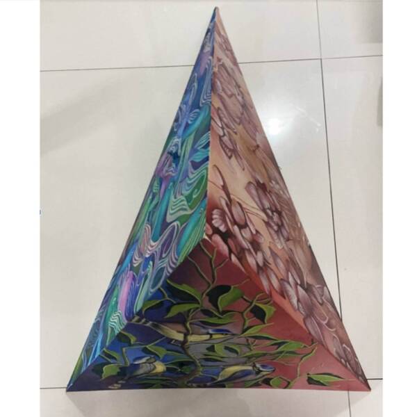 Ritu Kamath’s artwork Circadian Rhythm represents the chronobiology of nature. The work is a polyhedron with three intricately painted surfaces representing the sky, earth, and water. The surfaces meet at the apex indicating how the three are interrelated. The ticking clocks on the painted surfaces attract the viewer, reminding them that the process of life – whether plant, animal, or human – is an ongoing one and can last only if it is a sustainable one. The work presents a tree in a dreamscape, a life of fishes in visceral movements, and gentle human hands holding the birthing flowers- life’s journey, movements, and a nudge to our nature of care, inward and outward depicted in a mastery of color and detailing.