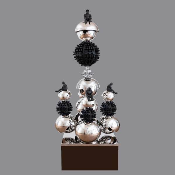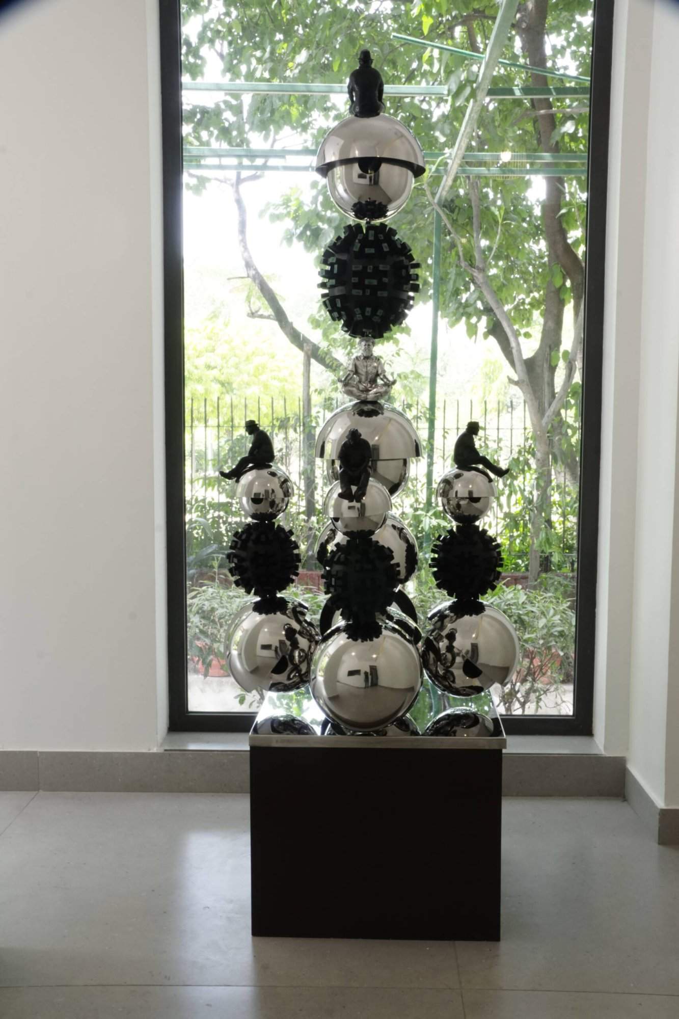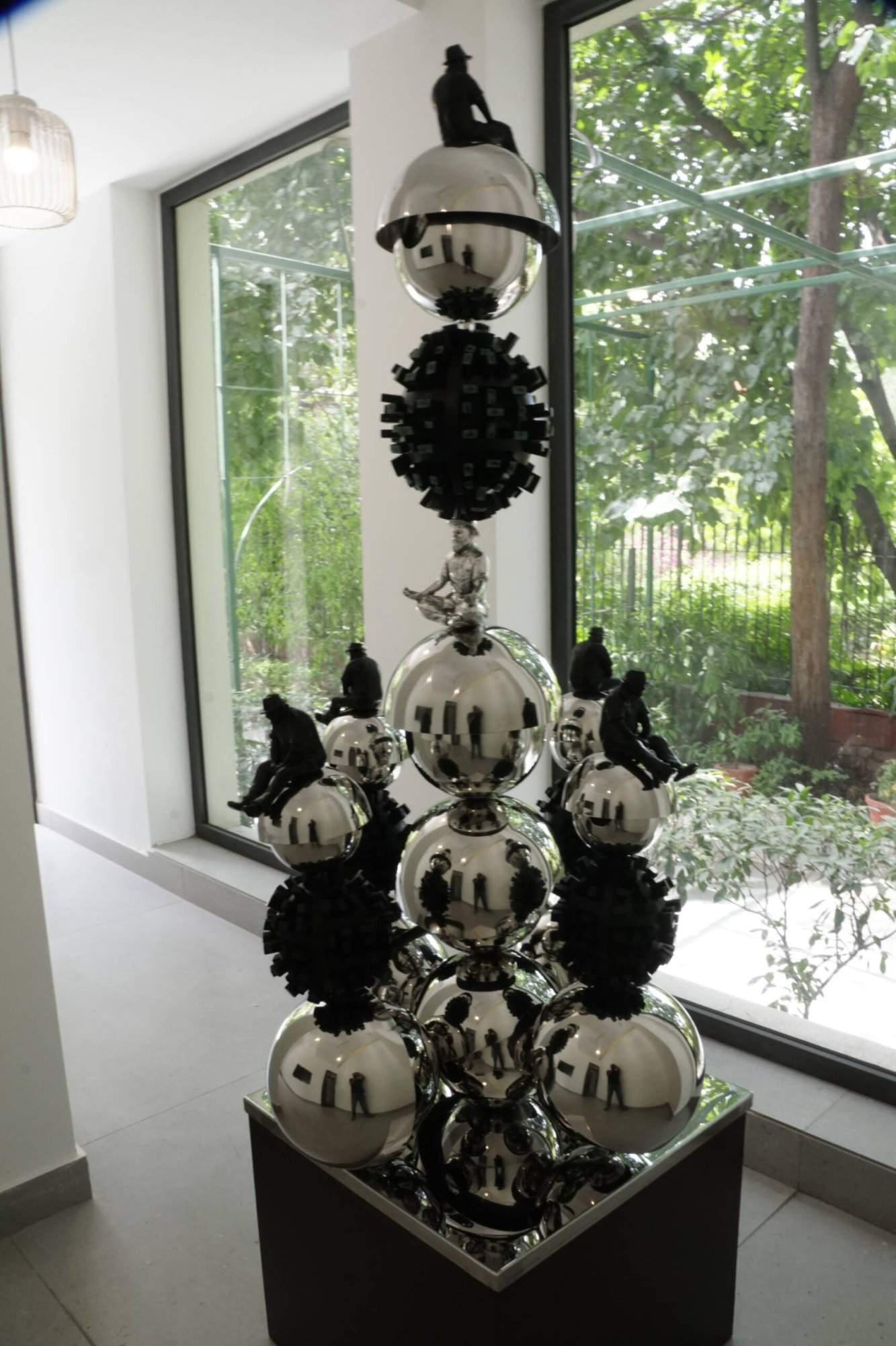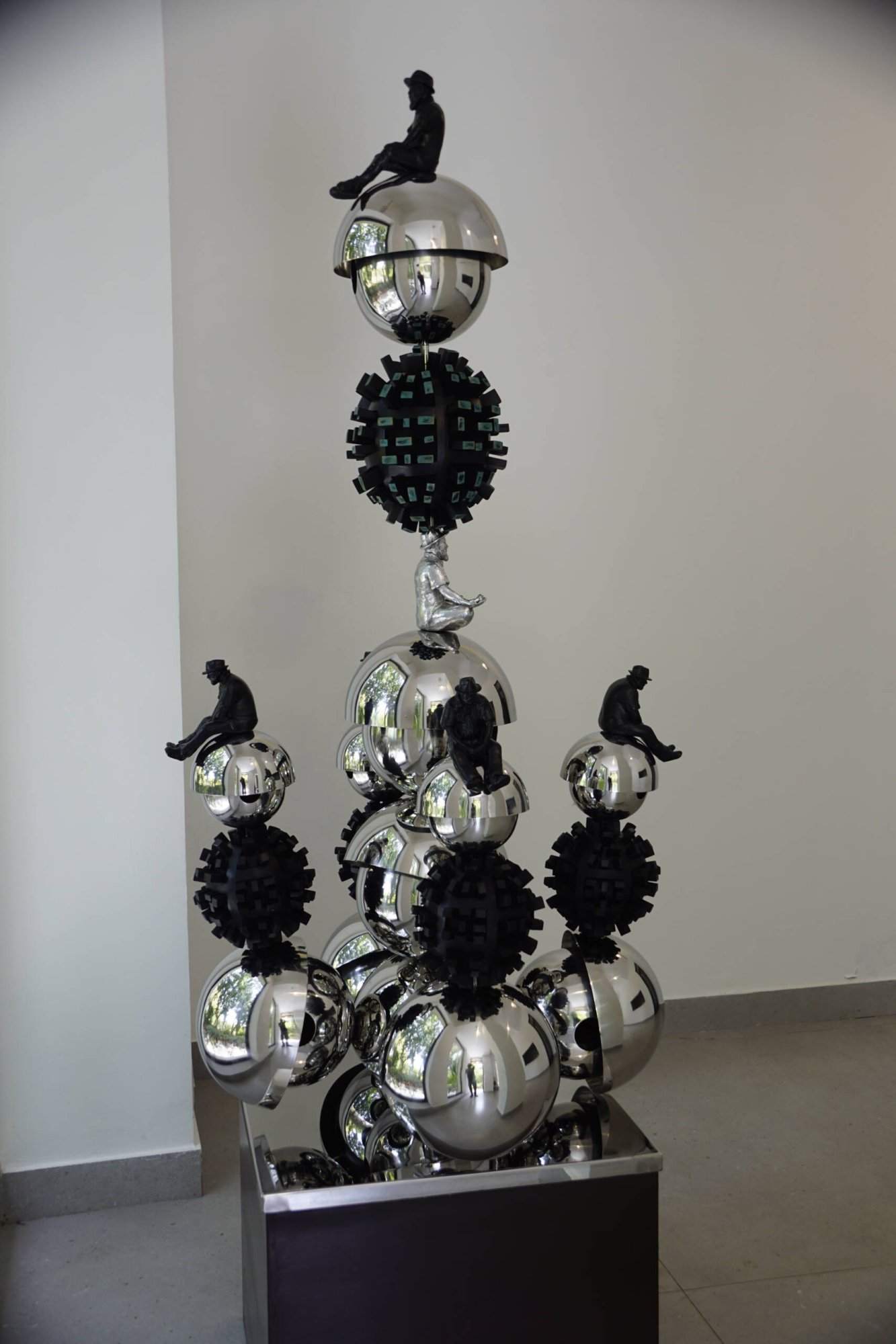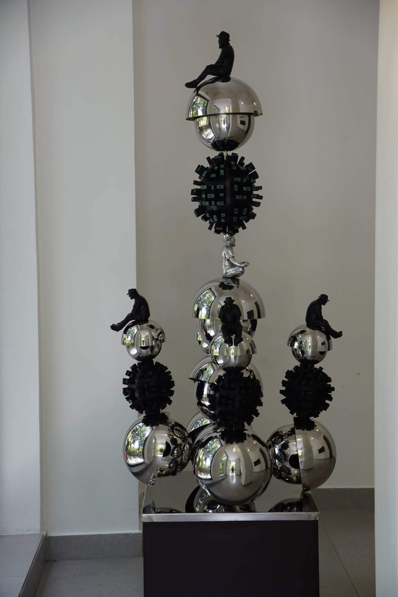 Shovin often organizes these cuboid structures in a spherical shape, that then becomes a metaphor for the world, since he plays with in the dark prophecy that the world would soon be covered by buildings and much of nature would disappear. He does however hope, like the family of birds that built a nest at the top of one of his large outdoor sculptures, hat ‘nature finds a way to co-exist’, with this metallic and concrete world.