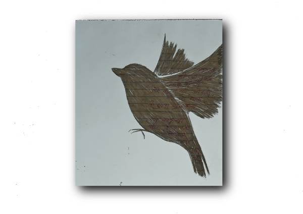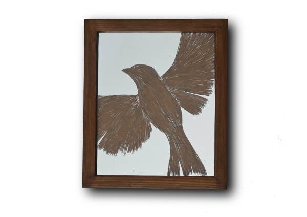 The artist’s fascination with mirrors as a medium and the process of working on them is unique and with the found objects, he weaves his storytelling in an experimental, innovative manner. This work (The Letters Written for You in translation of the title) is an ode to love and an immortal interaction with time and nature. The artist has used the old handwritten love letters exchanged between his parents in this series. The letters have existed since a long time before the artist’s birth; The form of the sparrows are hand etchings on the mirror on which the letters are visible, the romantic poetry readable written in young, passionate Hindustani handwriting.