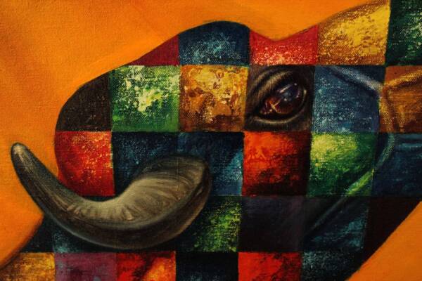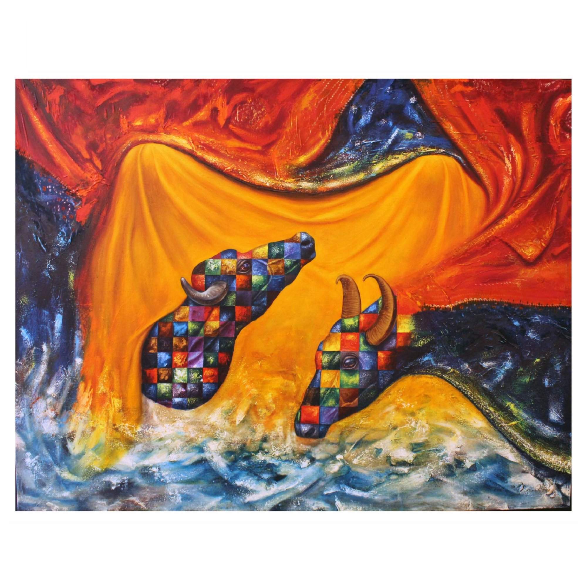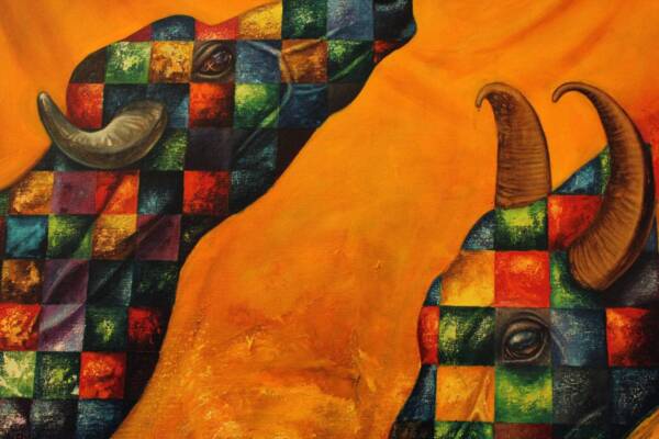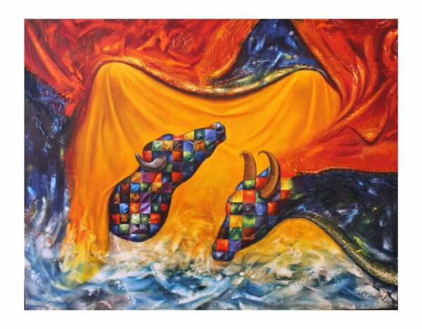 The buffalo has been a recurring imagery in the early works of the artist. Here, the artist depicts the ‘Raas Leela’, the ecstatic dance in divine love by Lord Krishna with his lovers, with the imagery of two buffaloes. The male and female buffalo depicted here, draped in bright yellow and orange clothes, with water gushing under them. Through the depiction of overwhelming love by using illuminating colors and the symbol of the buffalo couple, the artist creates an ambient space of love, using vibrant blocks of color on the body of the buffalos and playful drapery around them.