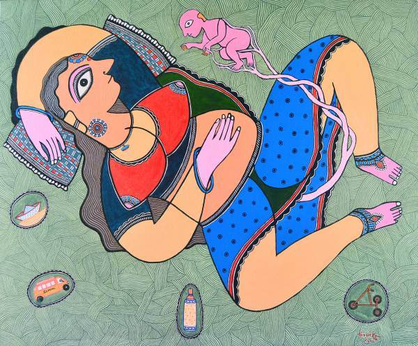 The artist has closely and intimately observed his and other families in the native village since his childhood. The act of giving birth and the cycle of birth and death have been an area of interest for the artist’s visual practice. This is a work where a pregnant mother is dreaming of the offspring, soon to be invited on earth. The artist’s personal history merges in this work with graceful surreal imagination and depicts an emotional contemplation from his experience. Various elements of welcoming childhood like milk feeder, baby cycle, or paper boat- can also be spotted in the background of the central figure. The colorful and figurative dynamic portrayed with detailed Madhubani strokes, illustrates a time to remember from someone’s life, expecting a birth, in anticipation of creation. Â