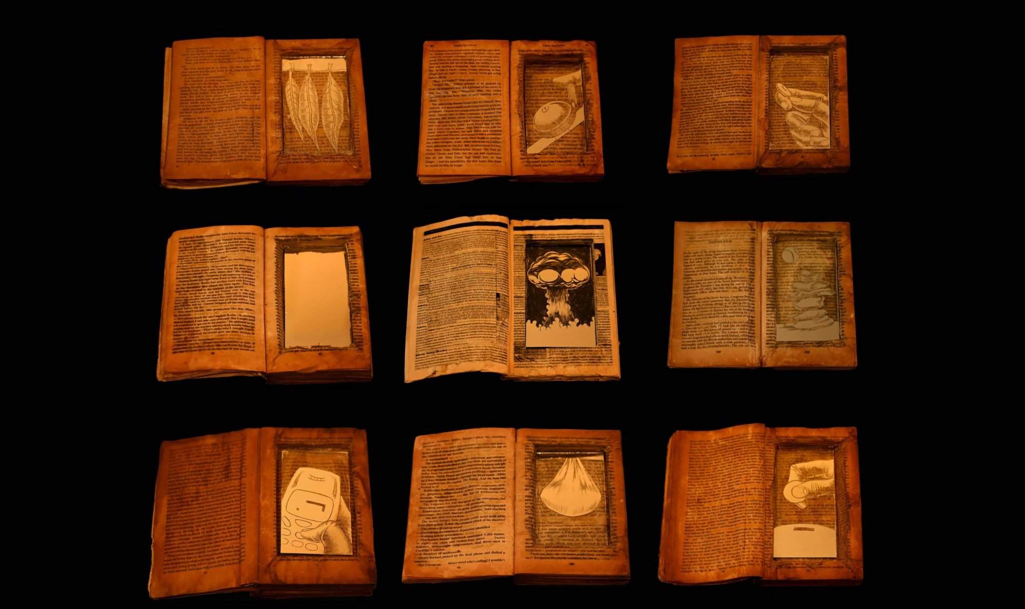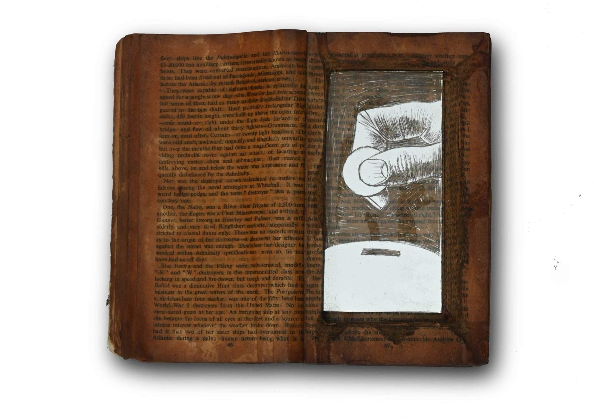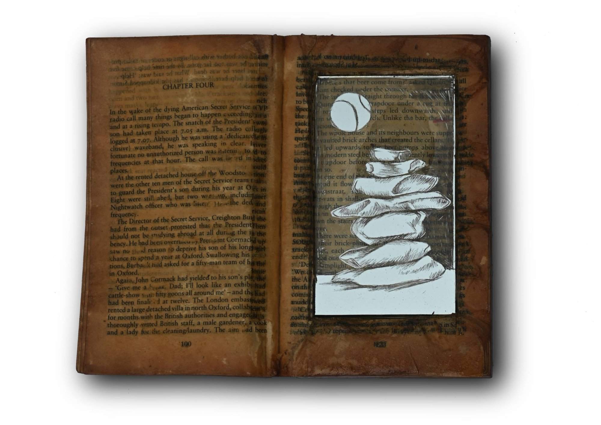 In this series of 9 works composed with old books and etched mirrors, the artist has fathomed into the pulse of the time, navigating through the past and immortalizing the moments and the emotions attached to it. The etched visuals on the mirrors, skillfully placed inside the hollow of the book’s body embody a memory where the personal history of the artist merges with the collective sensitivity. The work speaks on the changing notion of digitalization and urbanization through the change of the millennials and represents various objects of love and attachment from the book of time. The books were received by the artist through his familial lineage and with a strong conceptual framework, he depicts the objects from his years of growing up that poetically captures the essence of the time in a specific cultural context through cultural symbols.