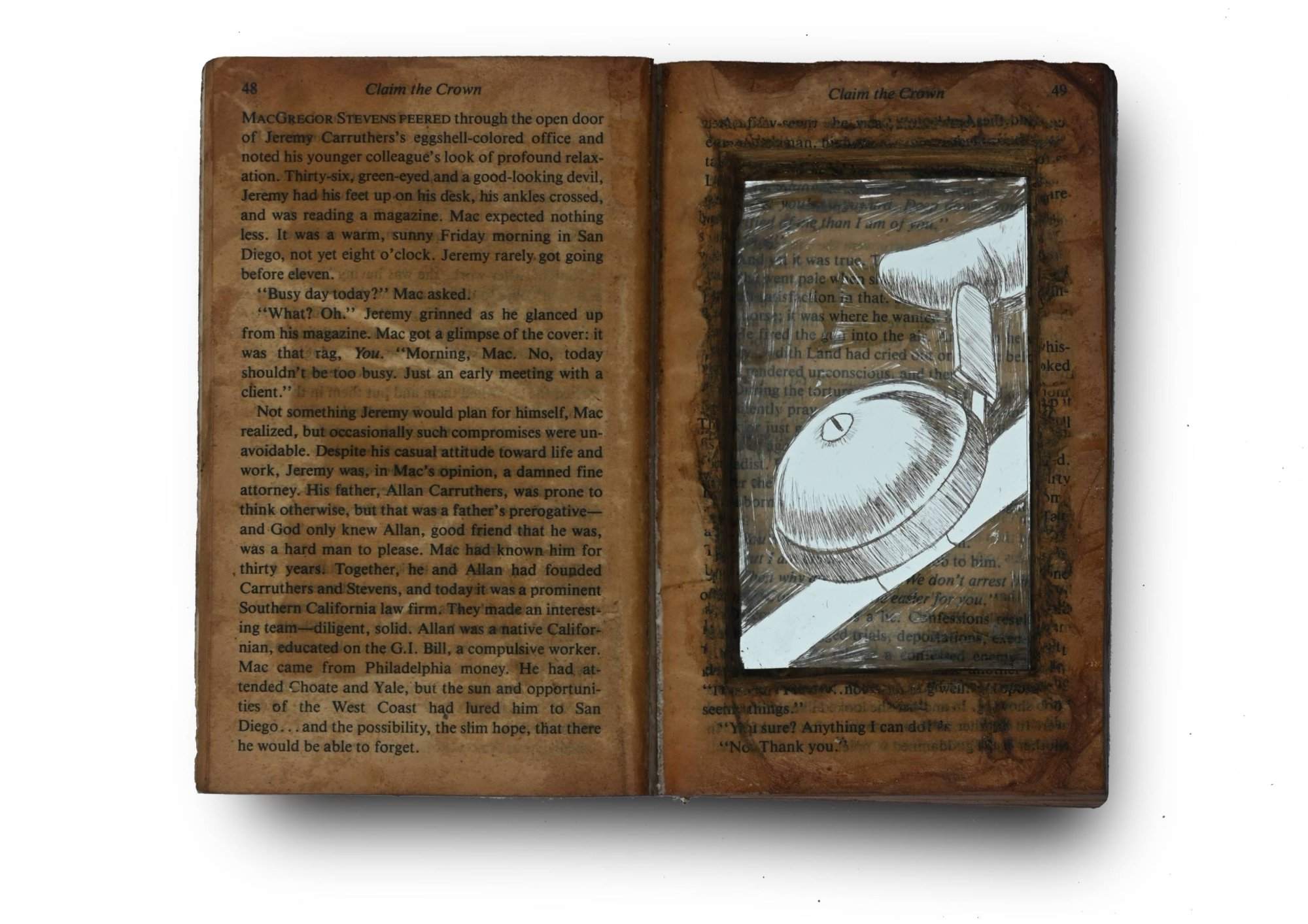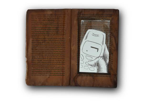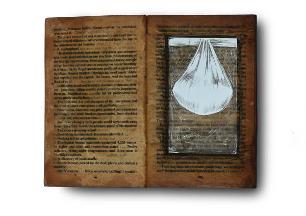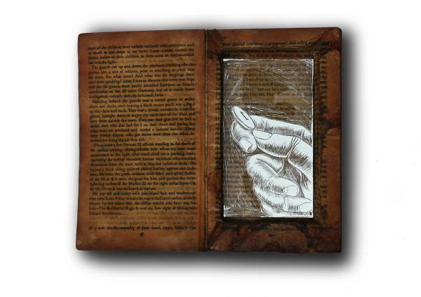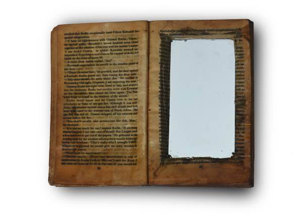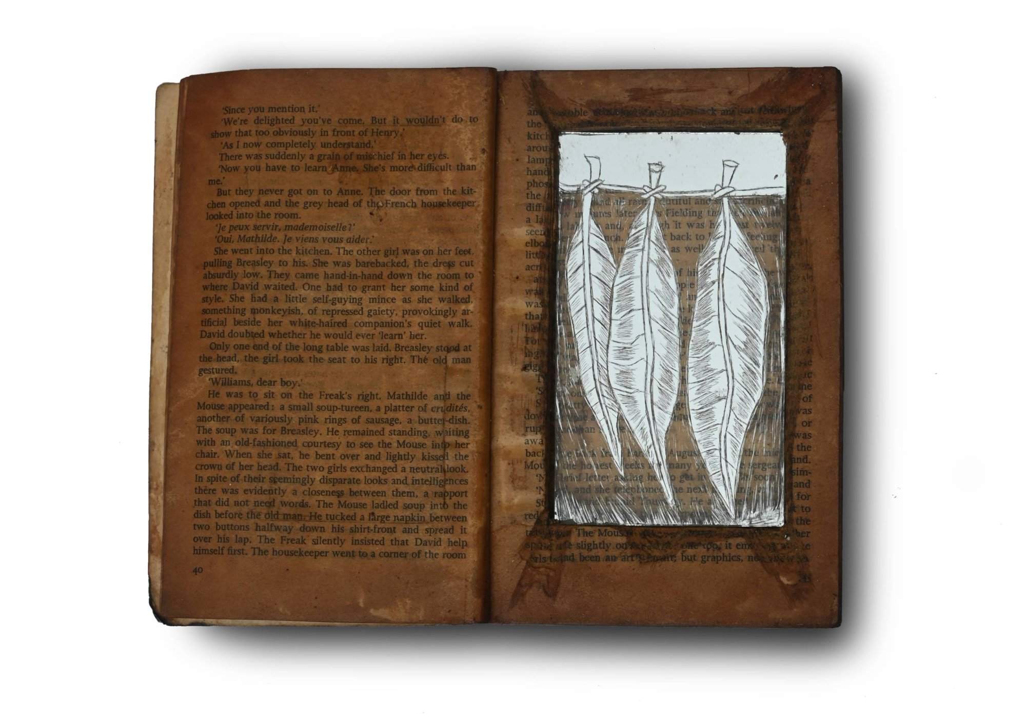 In this series of 9 works composed with old books and etched mirrors, the artist has fathomed into the pulse of the time, navigating through the past and immortalizing the moments and the emotions attached to it. The etched visuals on the mirrors, skillfully placed inside the hollow of the book’s body embody a memory where the personal history of the artist merges with the collective sensitivity. The work speaks on the changing notion of digitalization and urbanization through the change of the millennials and represents various objects of love and attachment from the book of time. The books were received by the artist through his familial lineage and with a strong conceptual framework, he depicts the objects from his years of growing up that poetically captures the essence of the time in a specific cultural context through cultural symbols.