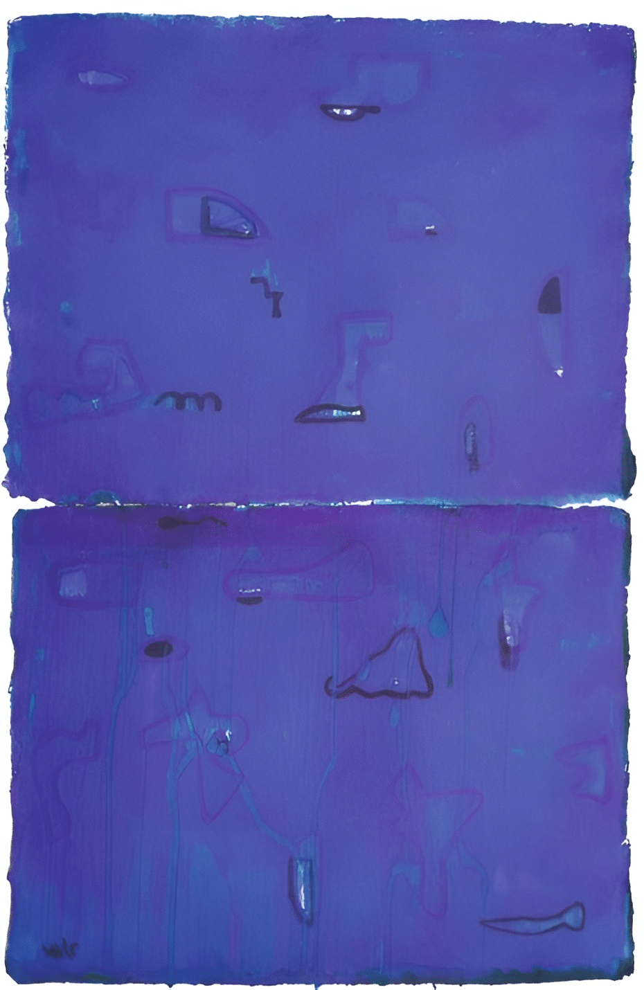 In this diptych work composed with a brilliant blue hue going toward purple, the forms of tools are represented in various degrees of visibility which makes the work layered and much more spacious. The skilled artistry regarding form and color is evident from this semi-representational voyage of meditative abstraction. The paintings of Rajendra Patil are passages through time where culture and personal history converge, the artist shares a perspective from the ground and the roots and contemplates our evolution through the tools we used historically through different ages and periods.