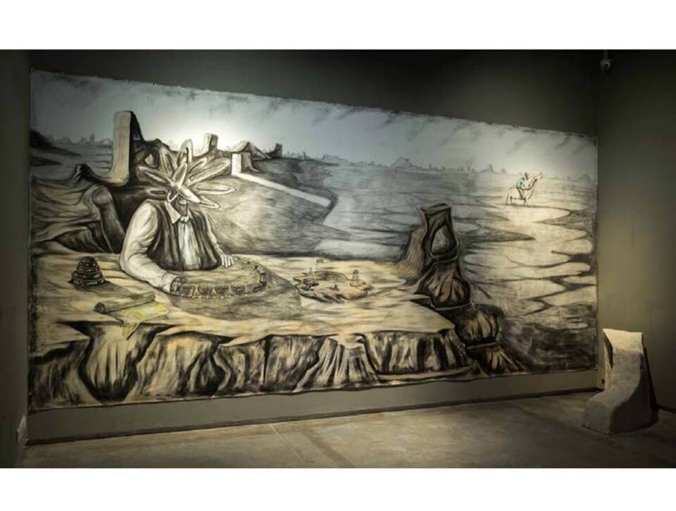 Counter Table of the Blackyard by Prabhakar Pachpute Charcoal And Acrylic On Canvas 6.5 ft X 15 ft 2017