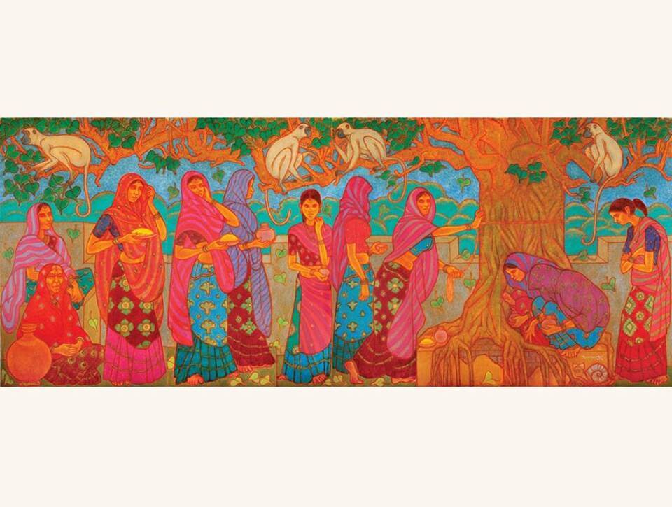 'Worship of Dasamata' A. Ramachandran Oil On Canvas 78”X192” 2014 “The Earth has its music for those who will listen.”–Reginald Holmes A Ramachandran's art, predominantly oozing a sense of decorativeness, witnessed a shift in its theme from urban angst to the peaceful aesthetics of the rural life. Village women have appeared in his…