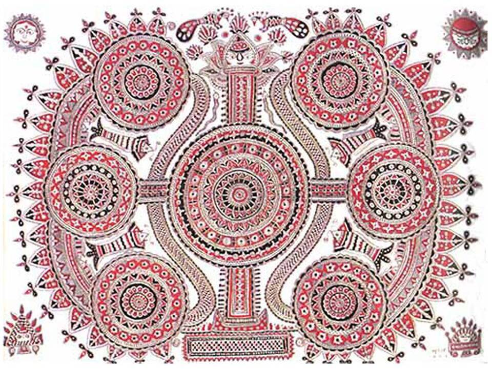 Khobar in the Madhubani Style by Karpuri Devi Vegetable Ink on Paper Early 1970’s “Love is to join and separate, To walk alone and together, To find a laughing freedom That lonely isolation does not permit.” - James Kavanaugh Madhubani painting, indigenous to Bihar and Nepal, is known for its religious, mythological and social themes, painted…