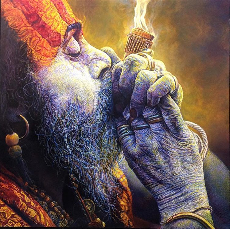 This photorealistic painting of a Sadhu showcases a lifestyle of austerity. The Sadhu’s face indicates incessant flow of piety. He doesn’t lose the realization of getting back to the grind in his unrelenting stance. The intricate technique of pointillism deploys an elevated perception. The strong colors in shades of yellow and orange showing turmeric and vermillion denote spirituality. The smoke comes from cannabis which the sadhus use to fall into a trance and feel one with God. The wrinkles on his ash laden skin reveal persistent participation in rituals. All this in a diligent search for moksha (salvation). A slight shade of yellow on his fingers and the background illuminates the whole subject, perhaps hinting that this Sadhu might be very close to achieving liberation. The ‘Sadhu’ series was inspired by Kumbh Mela, a Hindu festival known for its grandeur and value.